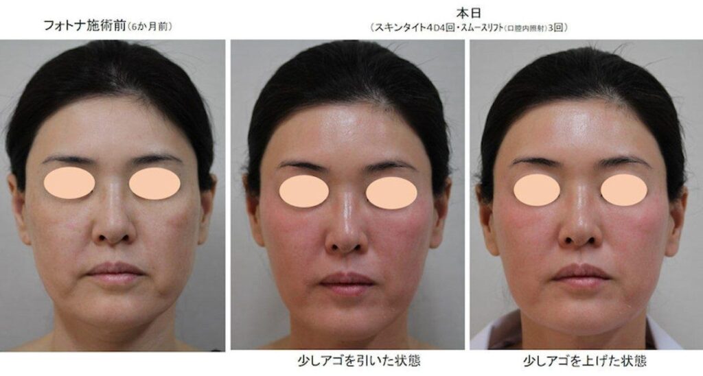 「じゃあ、一体この6か月で何のたるみ治療をしたのですか?」ということですが、私がこの半年で自分に行った施術は、フォトナ『スキンタイト4D』を4回とフォトナ『スムースリフト(口腔内照射)』を3回です。たるみに対する治療は他に何も行っていません。