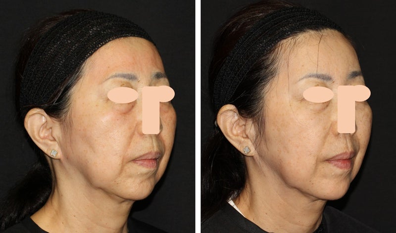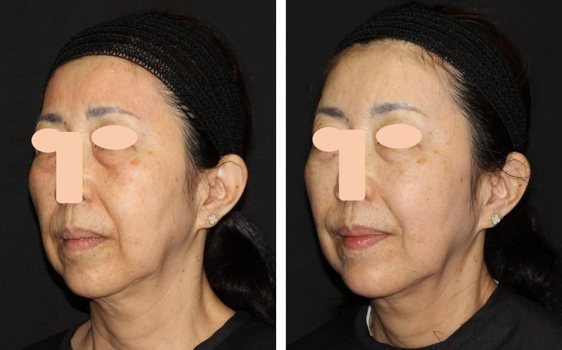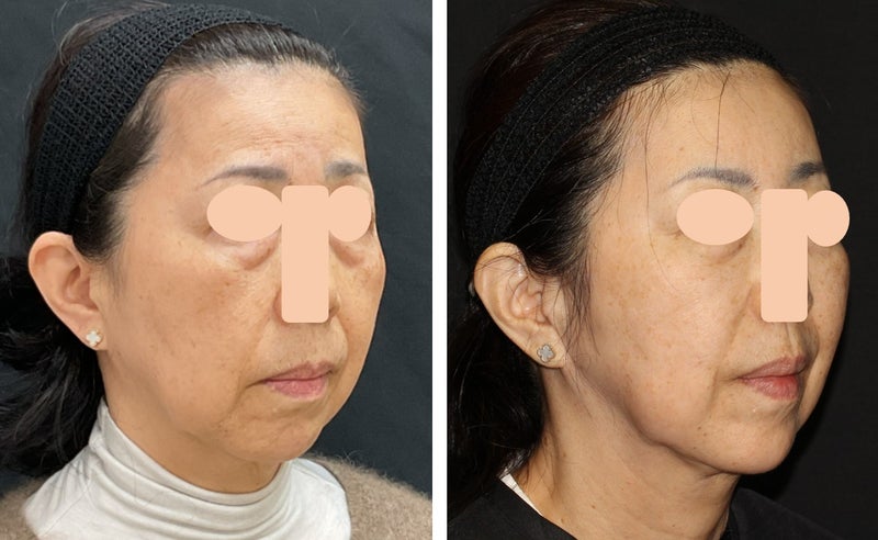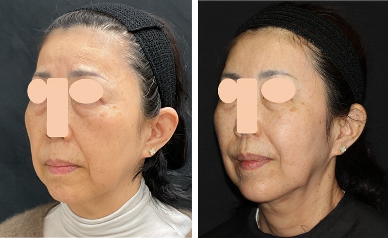 こうして並べて見ると、本当にお若くなられたことがよく分かります。私の個人的な意見として、フェイスラインにかかる頬の脂肪を、マシンを使用してもう少し引き締めることをご提案したのですが、患者様はヒアルロン酸での施術を気に入られたようで、マシンではなくヒアルロン酸を追加することでさらに改善していくことを希望されました。またいずれ経過をご紹介できればと思います。