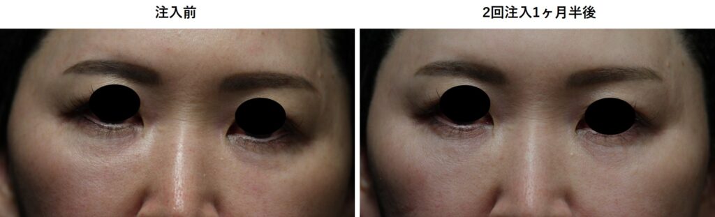 下眼瞼のわずかな凹みに対して、『ベビーコラーゲン』から『CGスタイラー』に切り替えて施術を行った患者様です。希釈した『CGスタイラー』(0.3㏄)を、2か月の間隔を空けて2回、カニューレで注入しました。