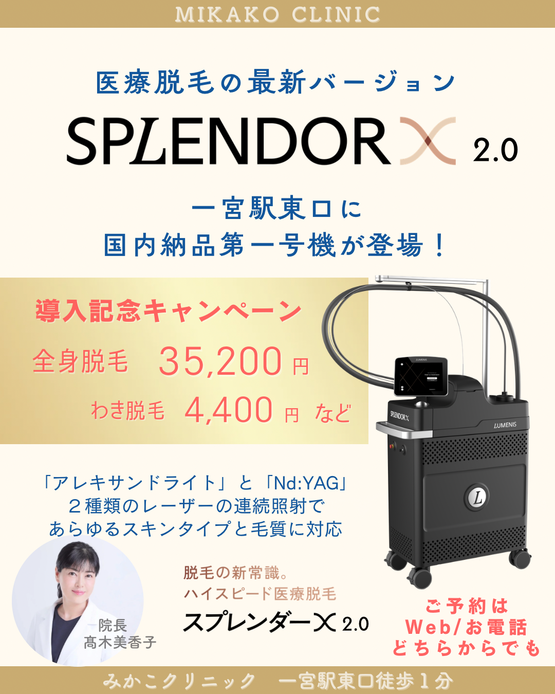 以上、最新式脱毛器『スプレンダーX』の凄いところを簡単に列挙しましたが、みかこクリニックでは、この最新機器での脱毛施術を、可能な限りのお値打ち価格でご提供していきます。