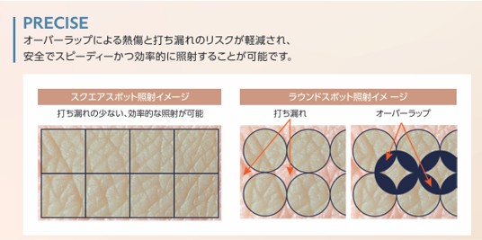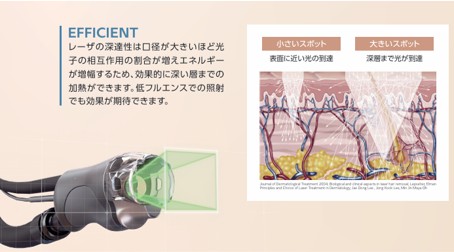 レーザーの深達度は口径が大きくなるほど効果的に深い層まで加熱できるので、低めのパワーでも効果が出せることになります。つまり、無理にエネルギーをあげなくても効くため、安全性も高いと言えます。