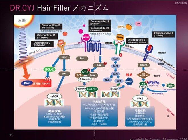 髪の再成長、頭皮の再構築のために開発された特許取得済みのペプチド複合体が配合された毛髪用注入剤です。ヘアフィラーには、CAREGEN社が開発した7種類のハイブリットペプチドが含まれており、それぞれが以下の3つの働きのいずれかを担います。