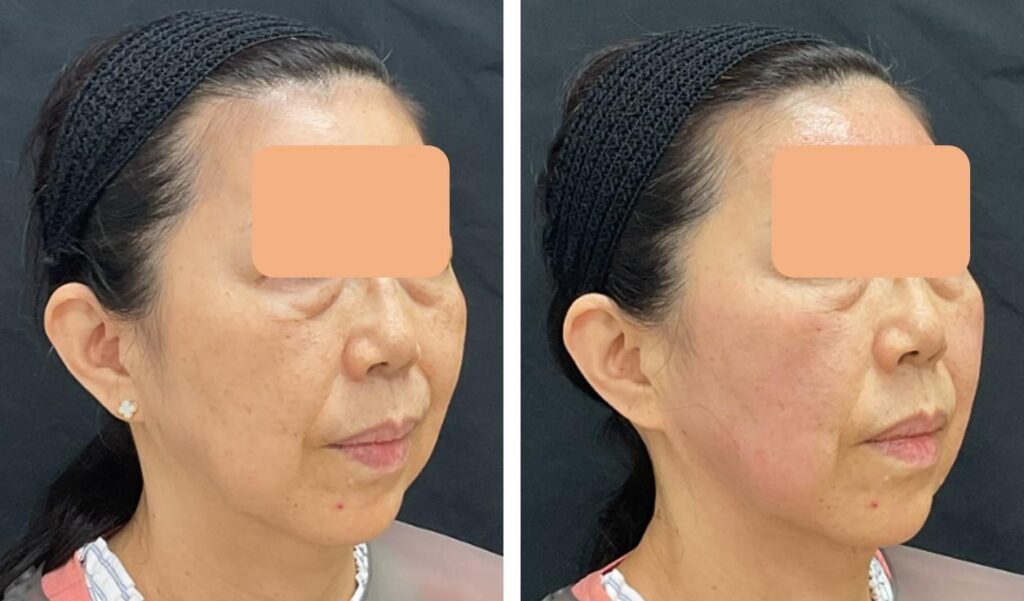 ボルニューマーは額を除く眉下からアゴ下にかけて照射して引締めを行い、リフテラは頬の下垂した脂肪の減量を期待して限局的に照射しました。