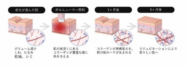 ボルニューマーはRF(高周波)を使用する治療機器です。皮膚表面を冷却保護しながら皮膚や皮下組織に安全かつ均一に熱を与え、 コラーゲンの収縮および再構築を促します。 それにより、様々な肌の若返り効果が期待できます。