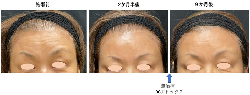 | 医師コメント | CGスタイラーの皮内注入と眉間と眉上へのボトックスを同時に行いました。その後は追加治療を行っていませんが、9か月後もまだ効果が持続しています。 |