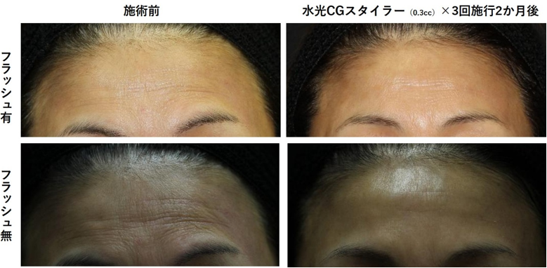 真皮内全体に注入する方法が有効です。プロファイロ、ジャルプロスーパーハイドロも有効ですが、『CGスタイラー』を水光注射で注入する方法も有効です。