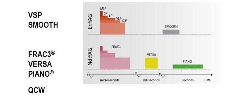 上の図は「2つの波長で6つのモード(エルビウムヤグレーザーが2つ、Ndヤグレーザーが4つのパルスモード)を選べる」ということを表しており、