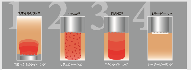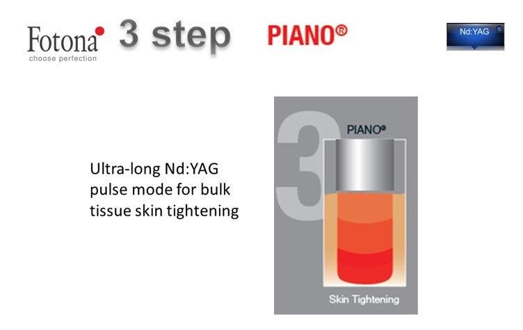 ステップ3のピアノ(PIANO)は、超ロングパルスモードのNd:YAG(エヌディーヤグ)レーザーで深部まで加温していき、熱による皮膚の引き締めをもたらします。