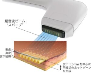 真皮だけに熱を加えたい場合に有効なのが『ソフウェーブ』です。ソフウェーブは真皮中層のみに60~70℃の円柱状の強力な熱だまりを作ることで、皮膚の引締めを行います。