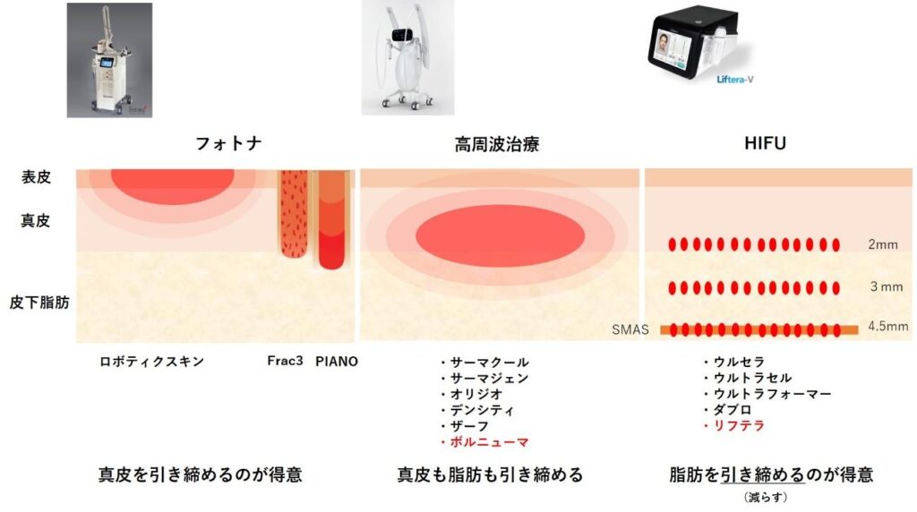 まずは『フォトナ』『ボルニューマ』『リフテラ』のそれぞれのマシンの肌に与える熱が作用する層を図に表してみます。