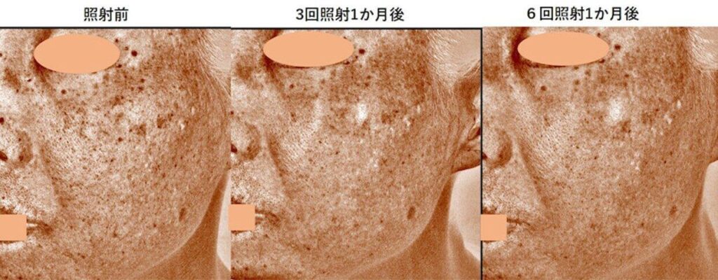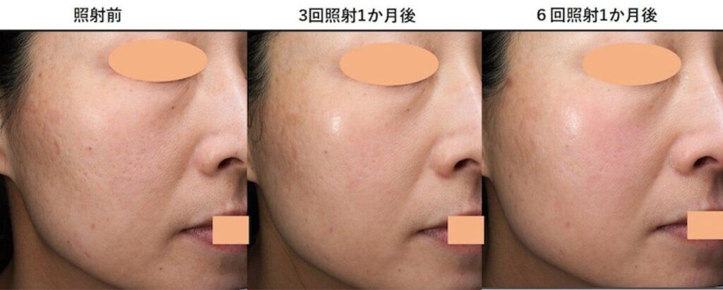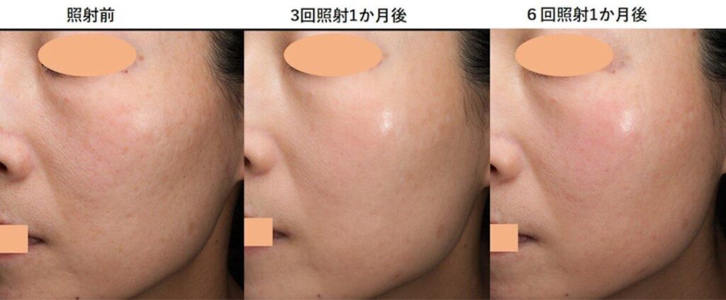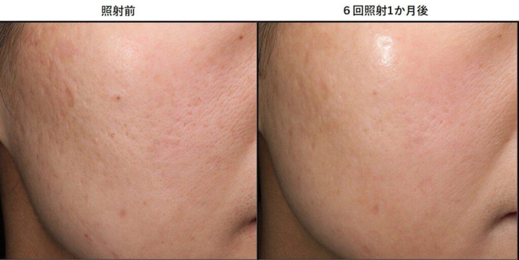 再診の際、肉眼で拝見した時の「肌のつや、肌の白さ、透明感」は回数を重ねるたびに増していき、どんどんピカピカになって行かれました。ニキビ跡の凹凸自体はまだ残っているのですが、そこに目がいかないほどの美しさが出てきています。