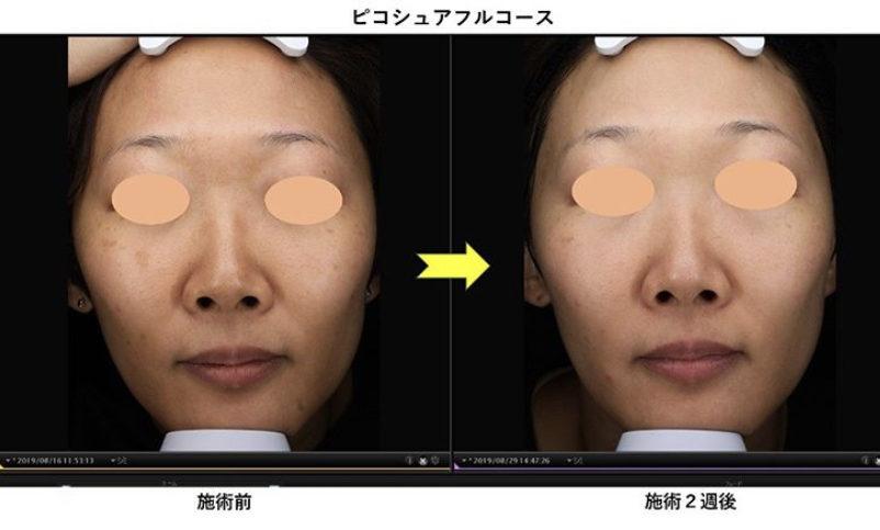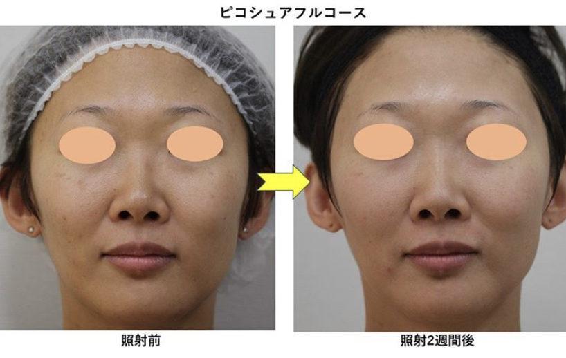 ビフォーアフターで比較すると、とても綺麗になられたことが一目瞭然でお分かりいただけると思いますが、いきなりアフターの綺麗な状態になれた訳ではありませんでした。上でご紹介したような途中経過をたどりながら、少しずつ綺麗になっていかれました。とは言え、治療期間を通して色素沈着も軽度に済みましたので、患者様としては気分よく綺麗になっていくことができたのではないかと思います。それはピコシュアの性能の良さもありますが、患者様ご本人のアフターケアのご努力もとても大きいものがありました。ピコシュア『フルコース』をチョイスした分、治療費用は多くかかってしまいましたが、この施術例をご覧になって、その価値があると思っていただける方にはぜひお勧めしたい美肌治療です。