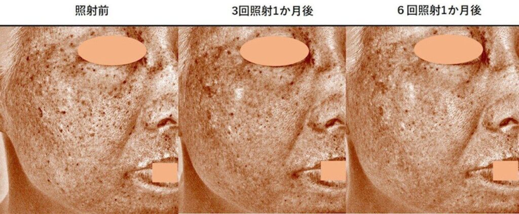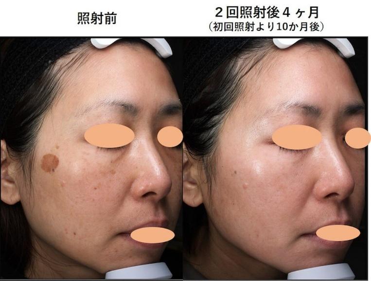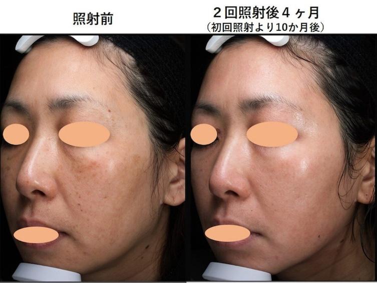 治療前にあった大きくて濃かったシミが、2回の照射で驚くほど綺麗になっていますし、お顔全体のシミもとても綺麗になっています。