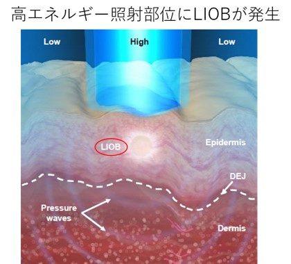 この「LIOB」って何ぞや、と思われる方もいらっしゃると思います。私もセミナーで初めて聞いたときは、「何だ、それは!」と不可解でした。LIOBとは、Laser Induced Optical Breakdown の略だそうなのです。LIOBについてはまだわかっていない部分もあり、理論についても仮説の部分もあるようなのですが、簡単に言うと、レーザー照射によって「急速な空砲形成」が表皮内に起こり、それによって生じた圧力波が外側に伝達され、これらの波が細胞を圧し、圧力による損傷を『装う』のだそうです。細胞がダメージを装うって、よくわからない現象ですが、細胞が「ダメージを受けた!修復せよ!」という指令を周囲の細胞に伝達するために、治癒反応が開始され、結果としてコラーゲンやエラスチンの増加が起こるのだそうです。このLIOBは表皮内で起こっているのですが、表皮の表面に傷はできないので、「ノンアブレーティブ照射」である訳です。なにせ新しい概念で、まだ不確実な部分があるのだろうと思いますが、簡単に言うと、「ダウンタイム少なく、肌の若返りが可能」ということでいいのではないかと思います。