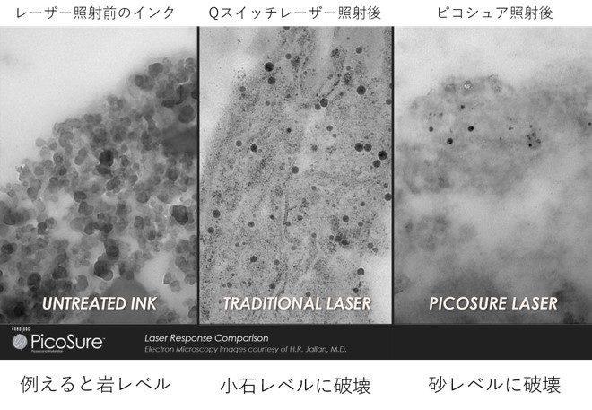 従来型の医療用レーザー機器は、ナノ秒(10億分の1)間隔での照射だったのに対し、このピコシュアでは、ピコ秒(1兆分の1)間隔での照射が可能となる最新鋭の医療用レーザー機器です。