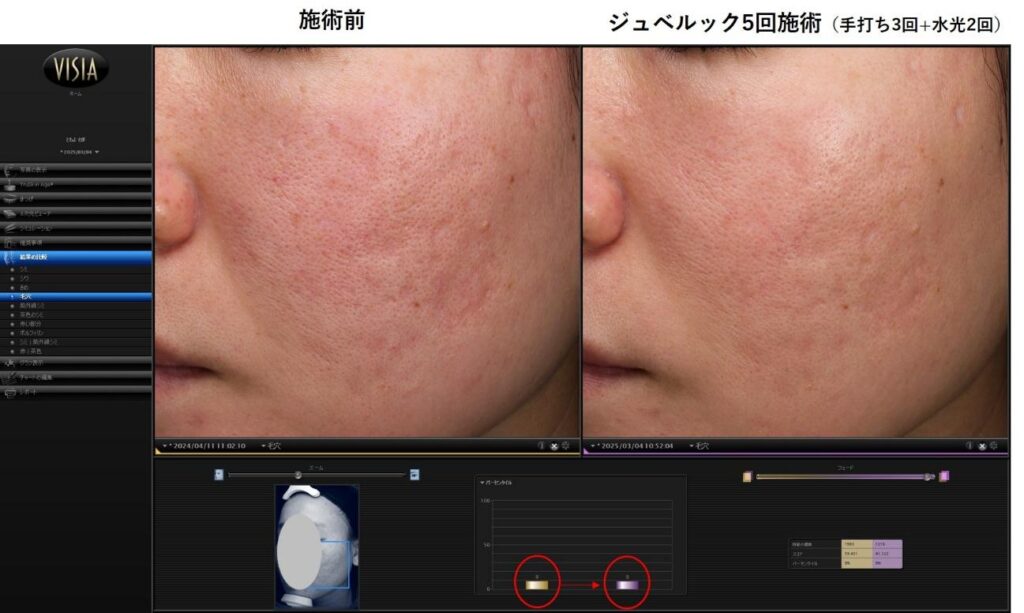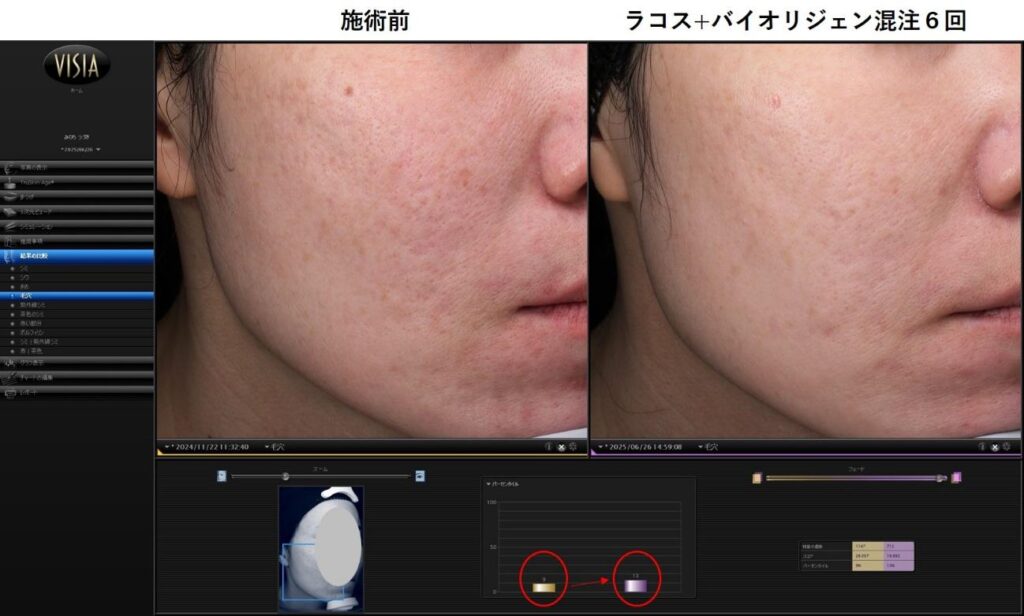 ラコスに非架橋ヒアルロン酸「バイオリジェン」を混ぜて水光注射で注入された患者様の経過です。VISIA撮影画像の数値はわずかですが改善しています。ニキビ跡も改善していることが分かります。