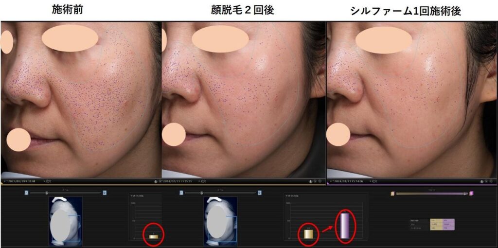 顔脱毛を2回施術した後、シルファームの肌質改善コースを1回行われた患者様です。徐々に毛穴が改善していることがVISIA撮影画像の数値変化からも見て取れます。
