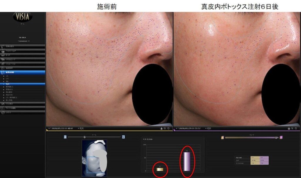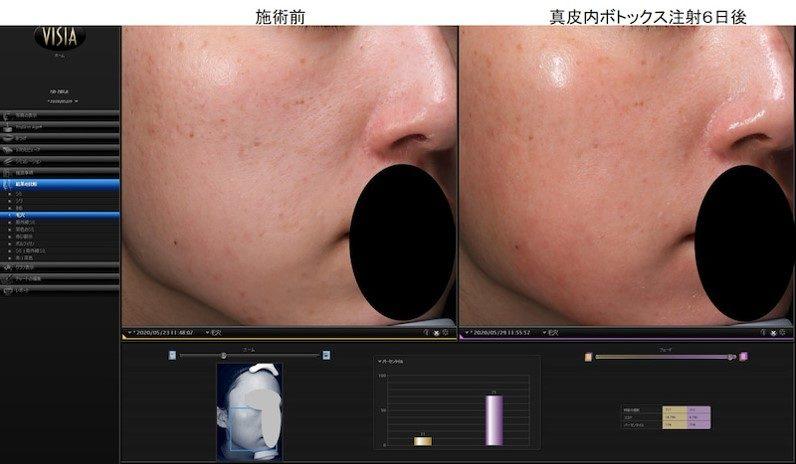 下のお写真の患者様の場合では、両頬の毛穴の目立つ範囲と小鼻にボトックス20単位を注射しました。注射前と6日後のお写真です。