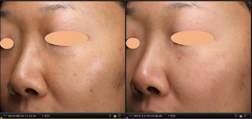 ピコレーザー『ピコシュア』のフラクショナル照射での改善例をご紹介します。下の写真はピコシュアフルコースを2回受けて頂いたモニター患者さんです。フラクショナル照射の結果、毛穴が改善していることがわかります。