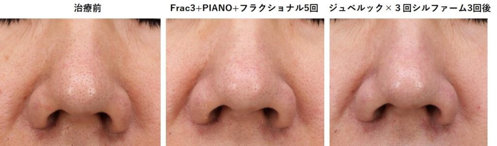 ニキビ跡フラクショナルレーザーを5回行っても、劇的な改善は見られていません。その後、さらにジュベルックの手打ち3回とシルファーム肌質改善3回を行って、少しずつ改善が見られましたが、鼻の毛穴の改善がいかに難しいかお分かり頂ける経過だと思います。