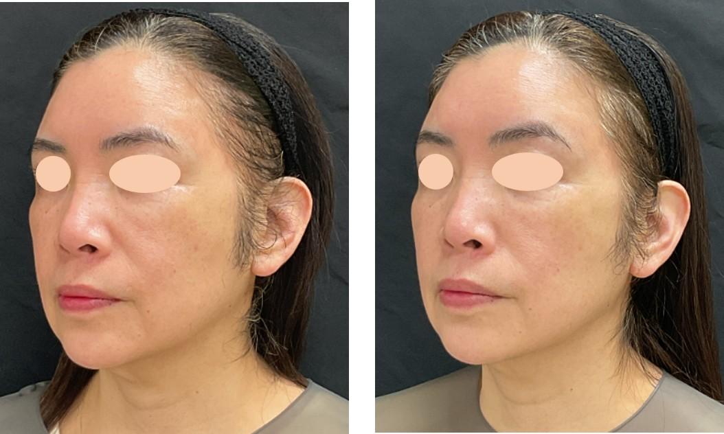 左の法令線(向かって右側)の上が膨らんでいるせいで法令線が深く見えることを気にして施術を希望されました。気になる箇所を集中して施術した結果、1回の施術で期待以上に結果が出たと喜んで頂きました。