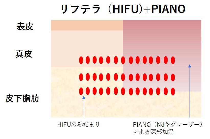 当院のリフテラは、単体で施術する場合には必ずフォトナのNdヤグレーザー『PIANOモード』を最初に照射し、余熱を入れておいてから『リフテラ』を照射します。PIANOは組織の深部まで熱を届けることが得意な波長で、PIANO照射そのものにもタイトニング効果が期待できます。また、HIFUの照射前に深部まで熱を入れて余熱した状態にしておくことで、HIFUの効果も高まる上に、HIFU施術時の痛みも軽くなり、まさに良いことづくしです。