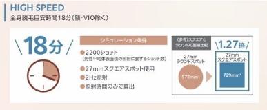 27mmという大口径でしかも四角い照射径で照射することができます。これにより打ち漏れが少なくできます。同じ27mmの口径でも、丸型の場合と比較すると1.27倍の面積を照射することができるのです。顔・VIOを除いた全身脱毛の照射時間(準備の時間は除く)が18分という驚きの速さです。