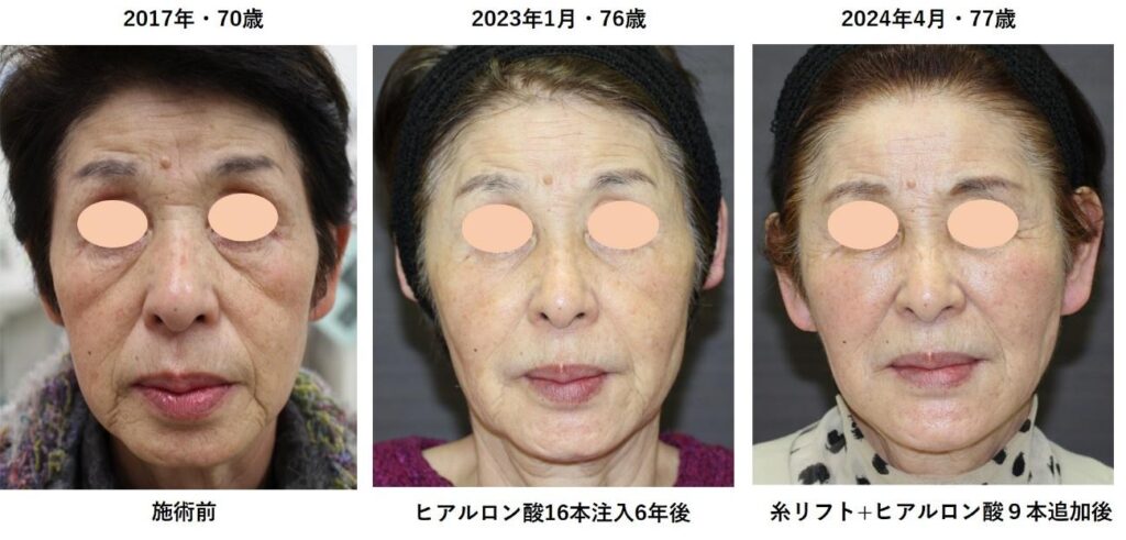 Total Facial Treatmentはヒアルロン酸の使用本数が多いため、施術時の費用負担は大きい方法です。しかし、ご紹介した症例のように、効果が5年以上持続している症例も珍しくないため、長期で考えると決してコストパフォーマンスが悪い治療ではありません。『老化によって減少したボリュームを補う』ことは、『若返り治療』にとって必須であり、最も効果が高い方法です。