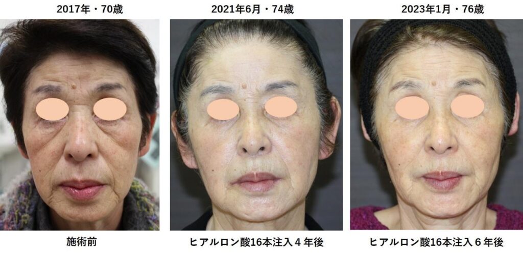 ヒアルロン酸の種類によりますが、短いもので3か月から約半年、長いもので約2年の持続が見込めます。しかし、実際にはもっと長く効果が持続している症例をよく経験します。