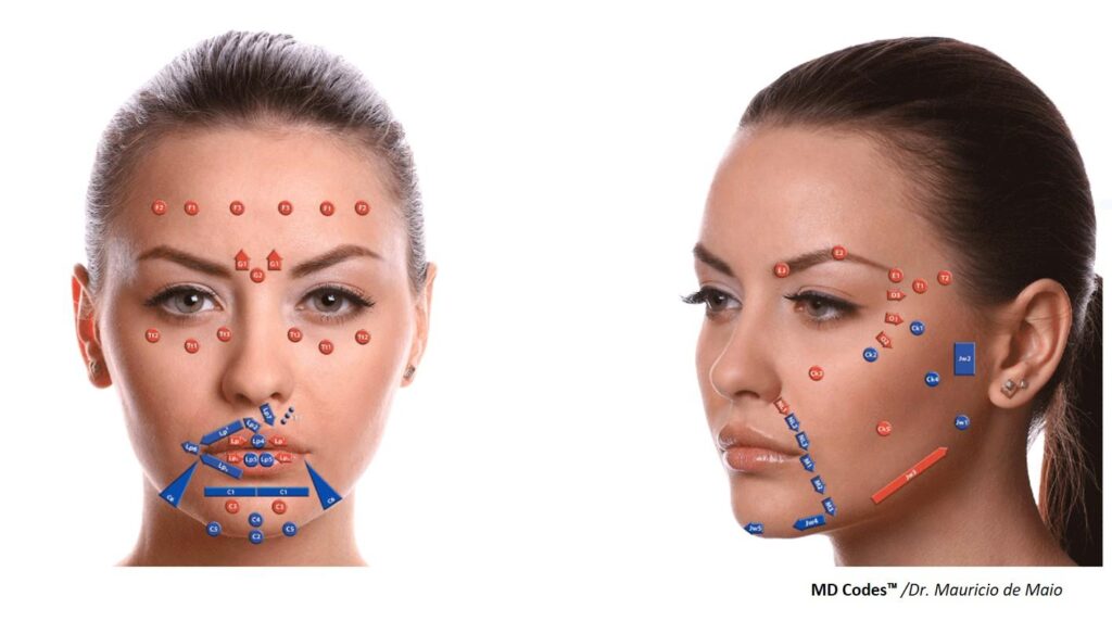 Total Facial Treatmentの提唱者であるDr. Mauricio de Maioは、ヒアルロン酸の注入箇所を客観的に表現するための『MDコード』も同時に提唱しました。MDコードを使用することで、施術の説明の際に患者様の理解を助けたり、または医師間の共通言語となるため情報共有がしやすくなりました。